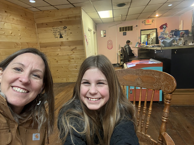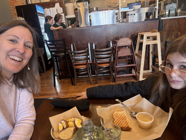 This trip involved a food tour! Our first stop on the way out of town was Early Edition to visit her sisters at work. All the workers asked when Aliza would start working there!
